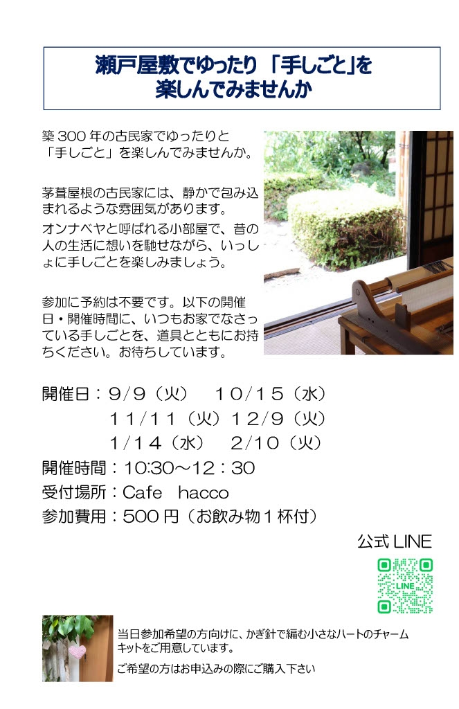 【募集】瀬戸屋敷でゆったり「手しごと」を楽しみませんか?