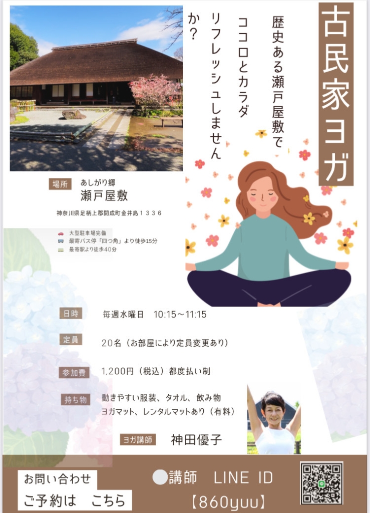 自然に囲まれた築300年の瀬戸屋敷で和の温もり、懐かしさ、水の音、風の音を感じながらヨガをしませんか。五感でヨガを愉しみながら 身体の不調にもしっかりと向き合います。