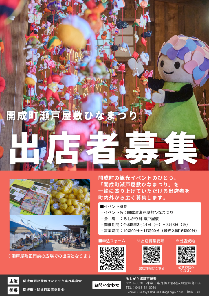 「開成町瀬戸屋敷ひなまつり」では、イベントをともに盛り上げていただく出店者を町内外から広く募集します。